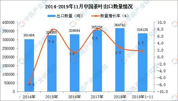 據(jù)中商產(chǎn)業(yè)研究院數(shù)據(jù)庫(kù)顯示,2019年1-11月中國(guó)茶葉出口量為334128噸,同比增長(zhǎng)1.7%;出口金額為1261.78百萬美元,同比增長(zhǎng)19.1%。數(shù)據(jù)來源:中商產(chǎn)業(yè)研究院數(shù)據(jù)庫(kù)2019年1-11月中國(guó)茶