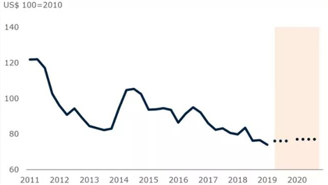 根據(jù)世界銀行的預(yù)測,飲料價(jià)格指數(shù)在2019年下降5%之后,預(yù)計(jì)2020年將上升2%。世界銀行在11月將飲料價(jià)格的經(jīng)濟(jì)預(yù)測進(jìn)行了上調(diào),并預(yù)測下降趨勢將在2020年穩(wěn)定下來。世界銀行飲料指數(shù)
